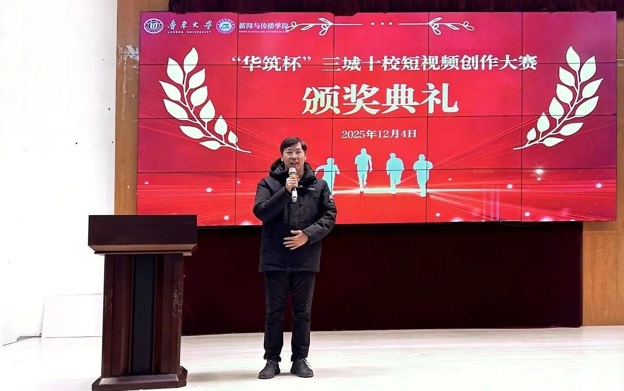 颁奖典礼上,鲁东大学新闻与传播学院院长张成良教授对本次大赛给予高度评价与充分认可。他强调:“荣誉的背后,是同学们将专业知识转化为具象作品的实践探索,更是通过镜头语言深化对专业认知、践行专业初心的生动体现,希望大家始终以优质作品为载体,传递时代正能量,讲好中国故事,发出中国好声音。”同时,张教授鼓励全体学子坚守创作本心,保持对视频创作的热爱与执着,在创新表达中不断探索艺术边界、突破自我局限,深耕领域、精进技能。此外,他特别感谢华筑传媒为青年学子搭建了展示才华、交流学习的优质平台,让大家得以在实战中锤炼本领、收获成长。