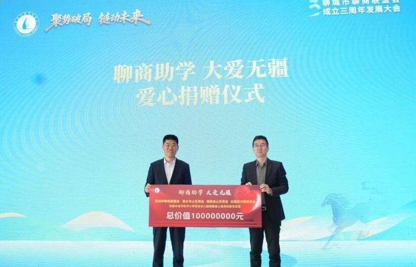 本次大会特别设置了“聊商助学 大爱无疆”公益捐赠仪式,联盟现场举牌捐赠一亿元支持教育事业,彰显了聊商群体的社会责任与担当。