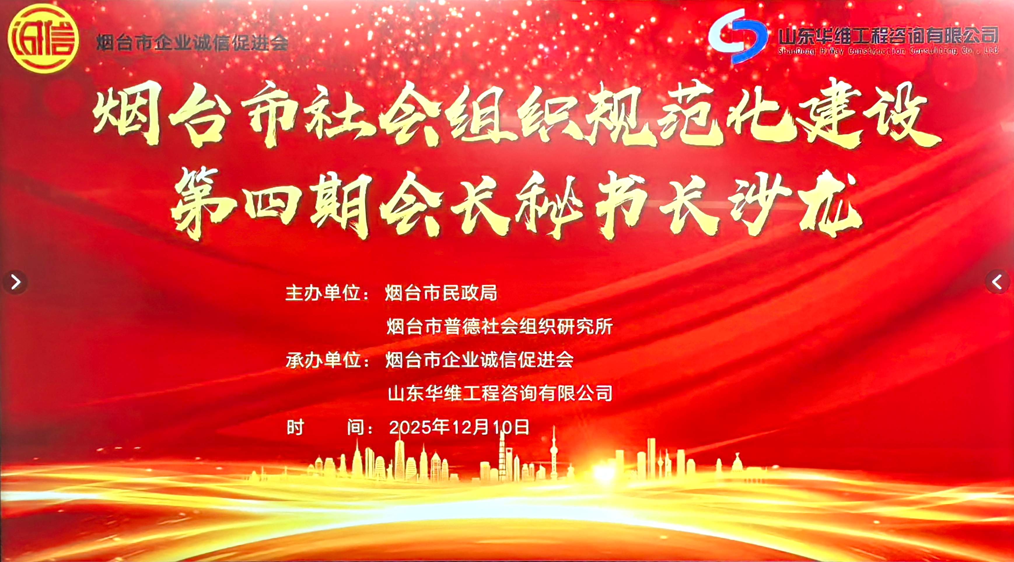 2025年12月10日上午,在烟台市社会组织扶持资金的支持下,由烟台市民政局、烟台市普德社会组织研究所联合主办,烟台市企业诚信促进会、山东华维工程咨询有限公司共同承办的“烟台市社会组织规范化建设第四期会长秘书长沙龙”成功举办。本期沙龙以“异地商会类社会组织规范化与诚信体系建设”为主题,旨在通过政研协同、实践交流,共同探索商会类社会组织健康发展的有效路径。