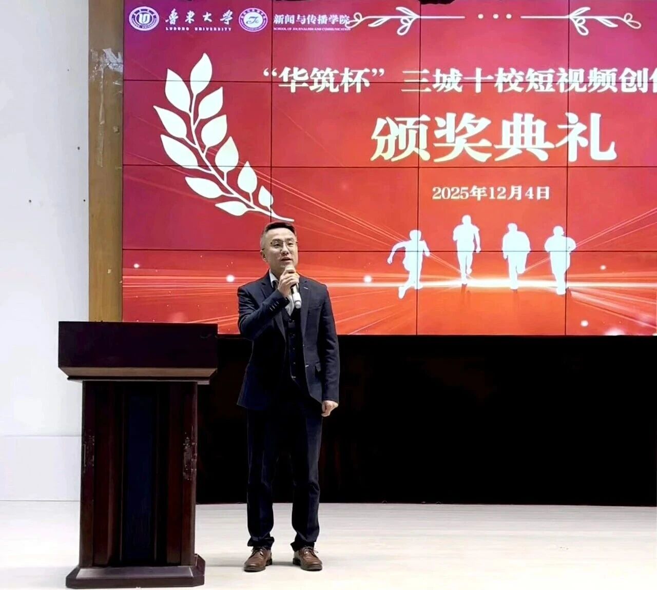 颁奖典礼上,鲁东大学新闻与传播学院院长张成良教授对本次大赛给予高度评价与充分认可。他强调:“荣誉的背后,是同学们将专业知识转化为具象作品的实践探索,更是通过镜头语言深化对专业认知、践行专业初心的生动体现,希望大家始终以优质作品为载体,传递时代正能量,讲好中国故事,发出中国好声音。”同时,张教授鼓励全体学子坚守创作本心,保持对视频创作的热爱与执着,在创新表达中不断探索艺术边界、突破自我局限,深耕领域、精进技能。此外,他特别感谢华筑传媒为青年学子搭建了展示才华、交流学习的优质平台,让大家得以在实战中锤炼本领、收获成长。